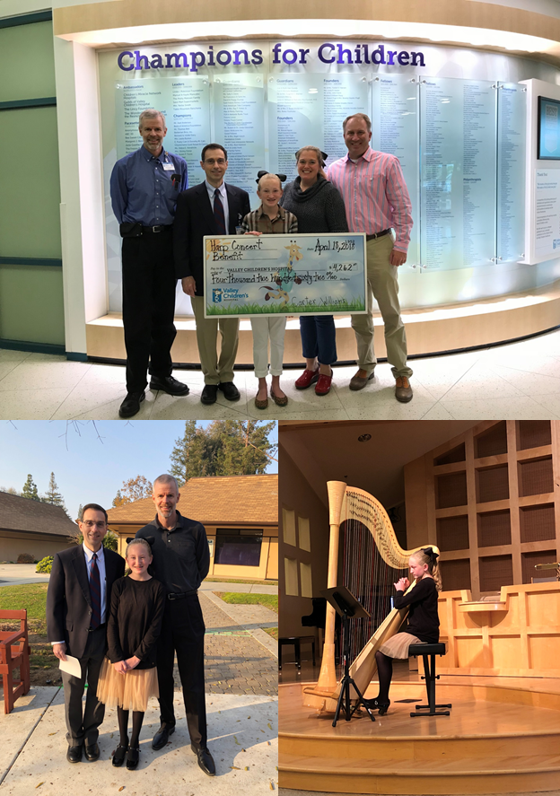 Carter is a cardiology patient who was born with an undetected faulty heart valve. At three days old, Carter had eight hours of open heart surgery that saved her life. As a grateful patient, Carter decided she wanted to give back. To raise funds, Carter generously donated her talents and put together a harp concert to benefit the Hospital. Her cardiologists, Dr. Caton and Dr. Petrossian, were on hand to accept the donation. Thank you, Carter, for your generosity and to all those that attended to make this concert such a success!