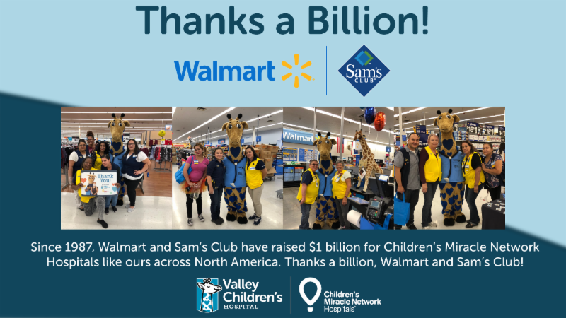 We are so grateful to Walmart's associates and customers for their ongoing support of Valley Children's. Because of campaigns like this, we are able to provide top-tier care to every kid who walks through our doors. Thanks a billion, Walmart and Sam's Club!