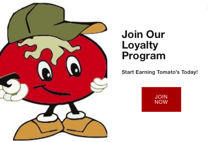 Earn Tomatoes Each Visit With Qualified Purchase. Choose To Receive A Reward at 250 Tomatoes Earned or Save Them For Future High Value Rewards. Redeemable Against Store Purchases Only.
