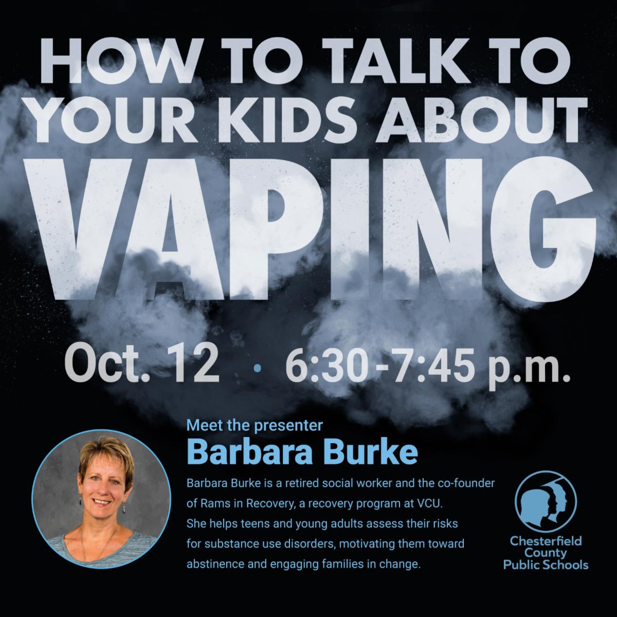 Join Chesterfield County Public Schools this Thursday, Oct. 12 for an in-person workshop to get informed, be prepared and take action to prevent vaping and other substance use.