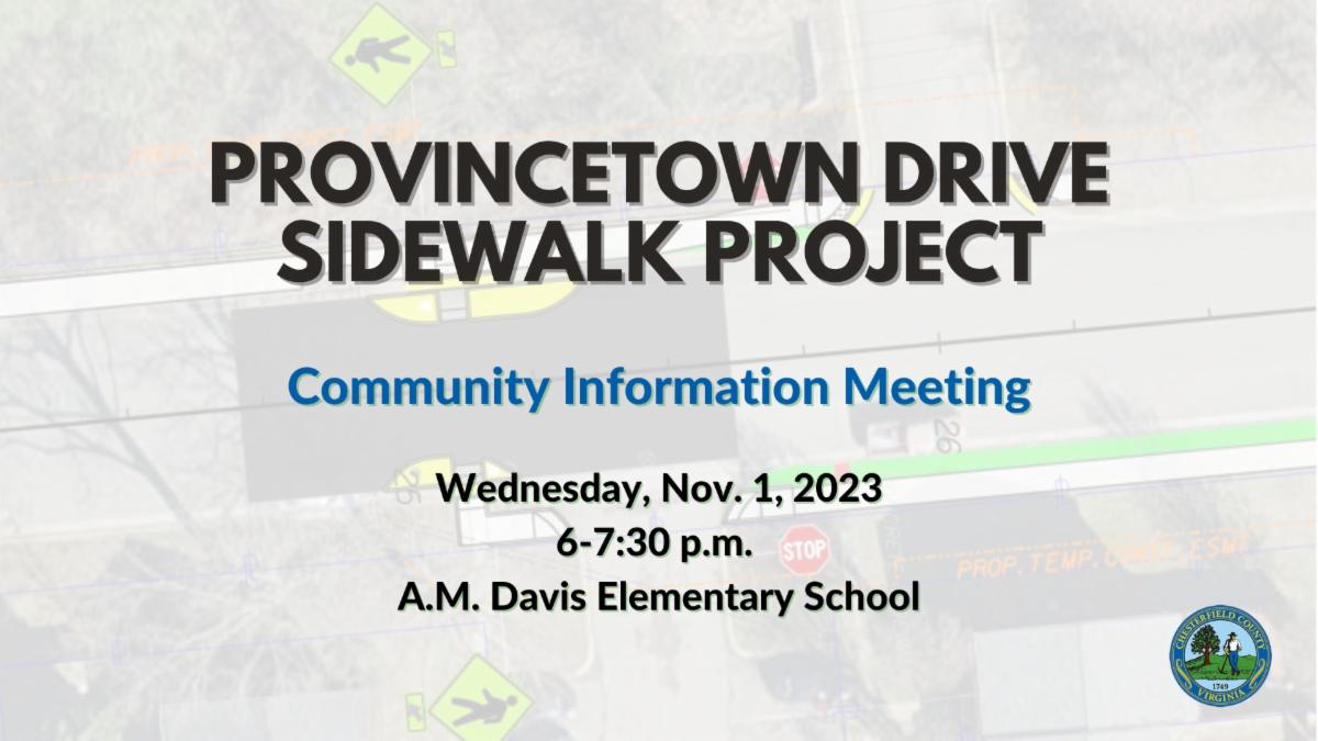Join the Chesterfield Department of Transportation this Wednesday, Nov. 1 from 6 to 7:30 p.m. at A.M. Davis Elementary School for a community information meeting regarding the Provincetown Dr. Sidewalk Project.