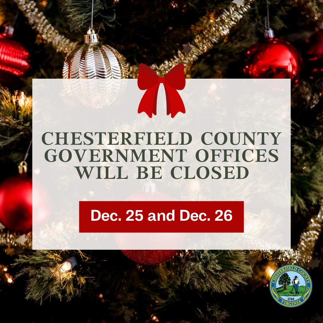 Chesterfield County government offices will be closed next Monday and Tuesday, Dec. 25 and Tuesday, Dec. 26 in celebration of Christmas!