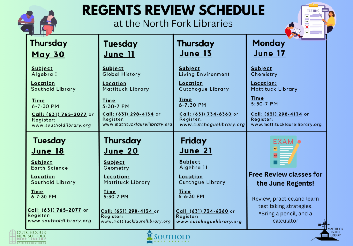 Get ready for the regents with these informational and helpful reviews! Registration can be done on the hosting library's website. | |