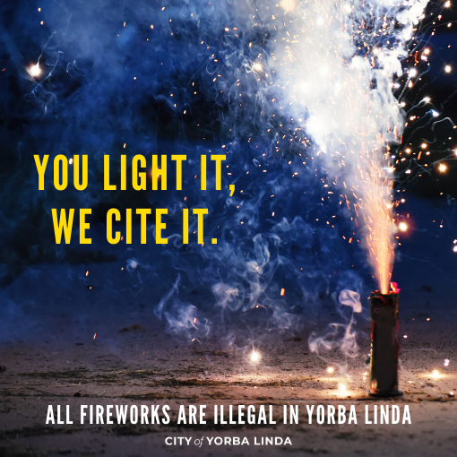 Yorba Linda Police Services and the City of Yorba Linda remind residents that possessing or discharging fireworks within Yorba Linda City limits is prohibited. If you light it, we'll cite it!