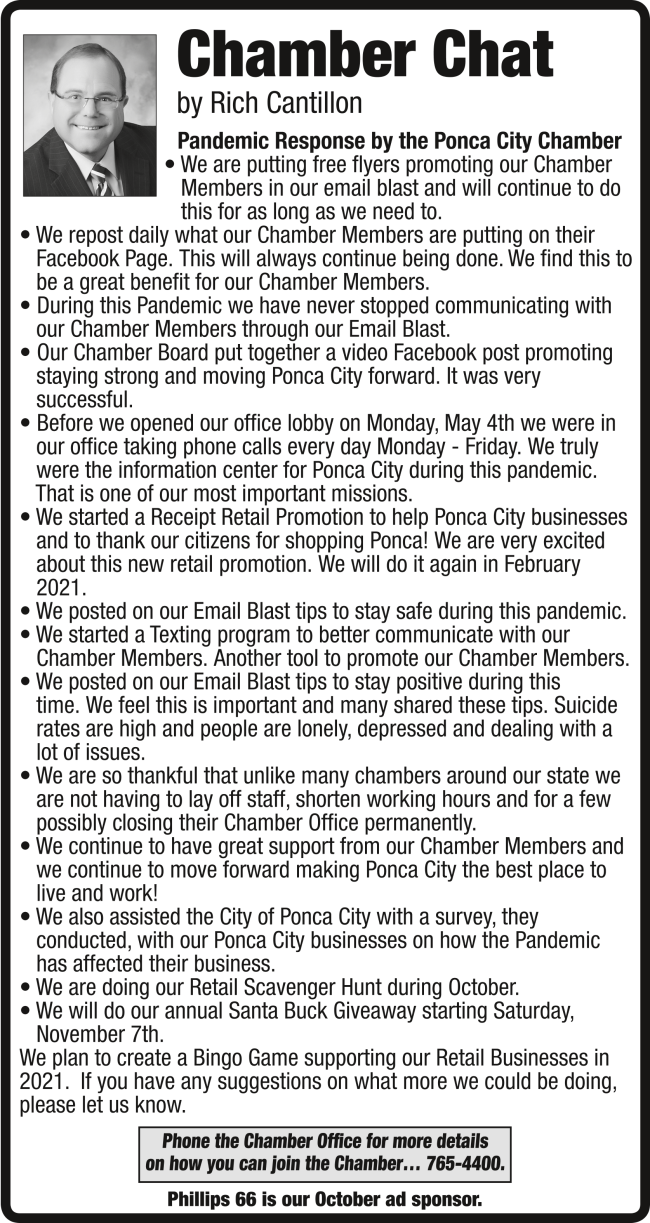 For only $75 your company flyer can be added to our email blast. It will run for 4 weeks or at least in 8 emails. Contact Zach by email zach@poncacitychamber.com if you would like to add your flyer to our email blast. Also if you don't have a flyer Zach can help you create one.