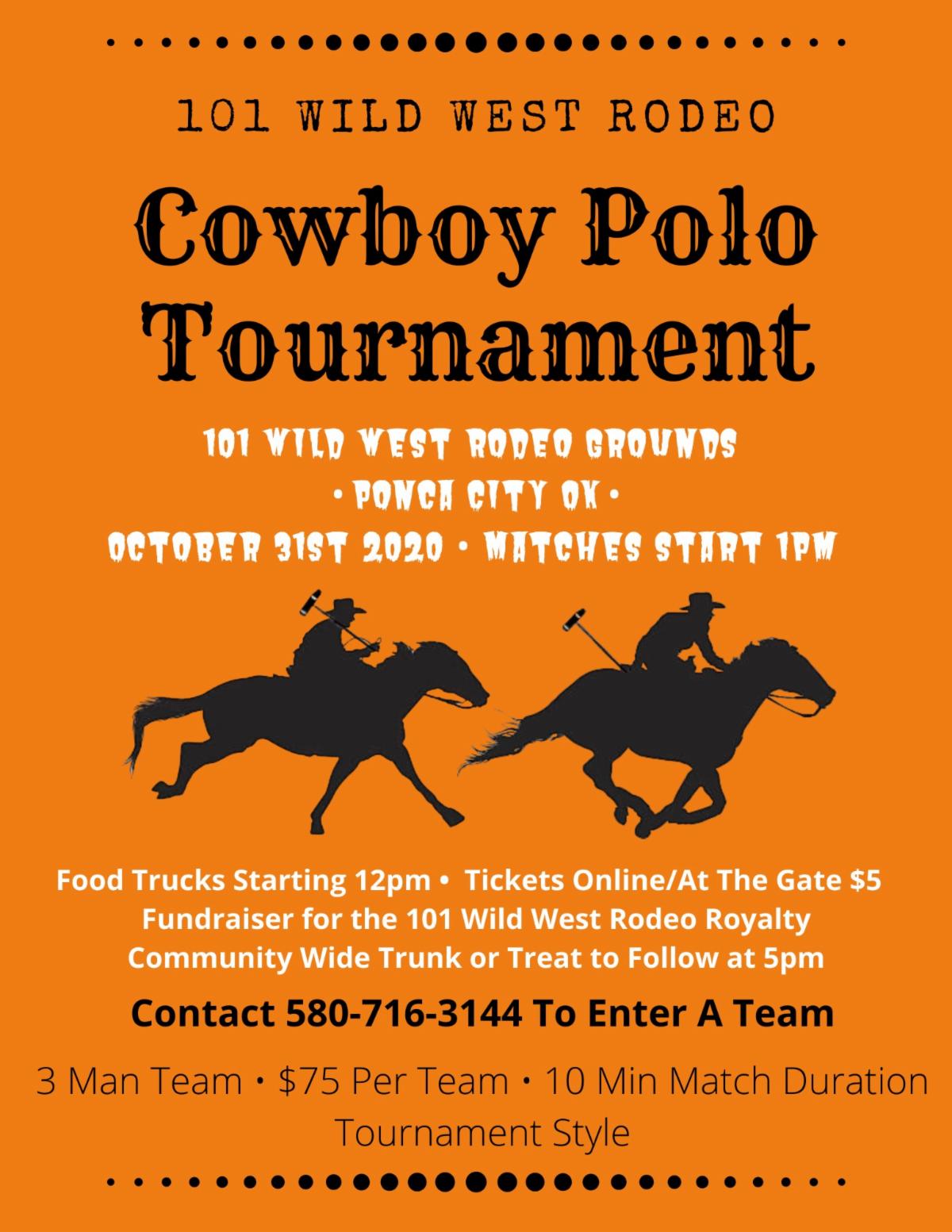 Following the cowboy polo tournament, the 101 Wild West Rodeo Committee is hosting a community-wide Trunk-or-Treat at 5pm! This event will be outdoors and open to the public, so grab the kids and come on down! If you or your business are interested in hosting a booth/trunk, please contact Lauren Meador 580-716-3144 or Tammie Coleman 580-401-0743. Looking for 20-40 businesses or individuals who would like to have an area! Individuals and businesses will need to provide their own candy.