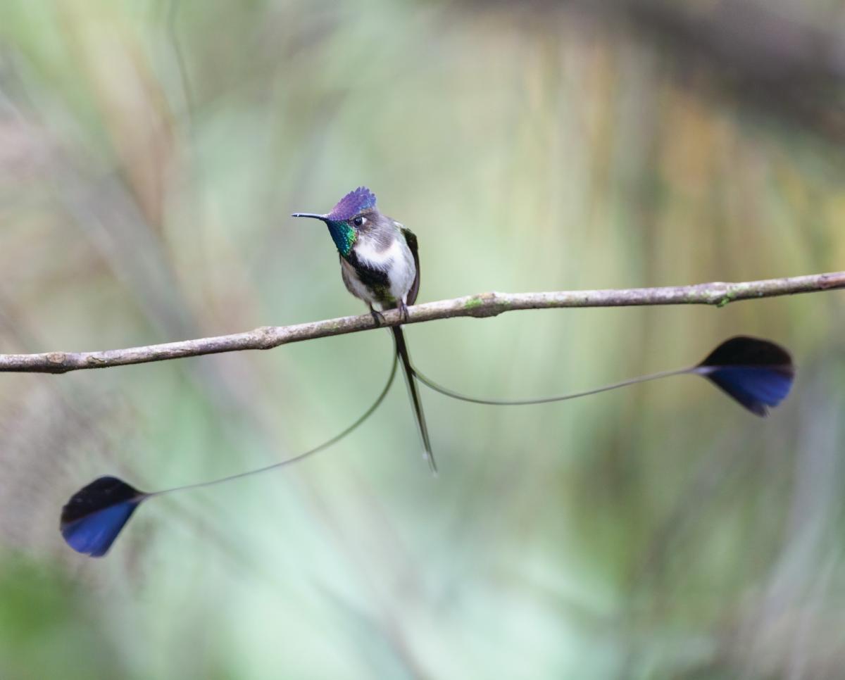 It is named after the birds' marvelous fan-like racquet-shaped tail feathers which they move up and down to impress the female in a glorious dance of love. The male's outrageous tail, blue crown, and iridescent green gorget ranks this species as one of the world's most spectacular birds. These hummingbirds feed on flowers at low to middle elevations, usually at the forest edge or in clearings. Its habitat and the flowers upon which it depends is shrinking and this beautiful species needs support for habitat restoration. We will be partnering with the American Bird Conservancy that is working to expand their habitat with the purchase of 1,200 acres.
