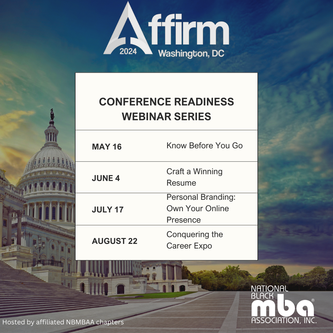 The National Black MBA Association (NBMBAA) affiliated chapters are thrilled to announce a four-part webinar series designed to equip you for a phenomenal experience at the upcoming Affirm 2024 National Conference & Career Expo, happening September 17th - 21st, 2024, in Washington D.C.