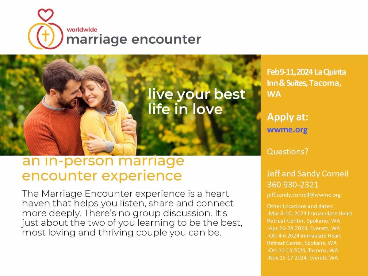 For more information about Worldwide Marriage Encounter, please visit www.wwme.org. For questions, or to find out more about a Virtual Encounter Weekend, feel free to contact: Jeff and Sandy Corneil 360-930-2321.
