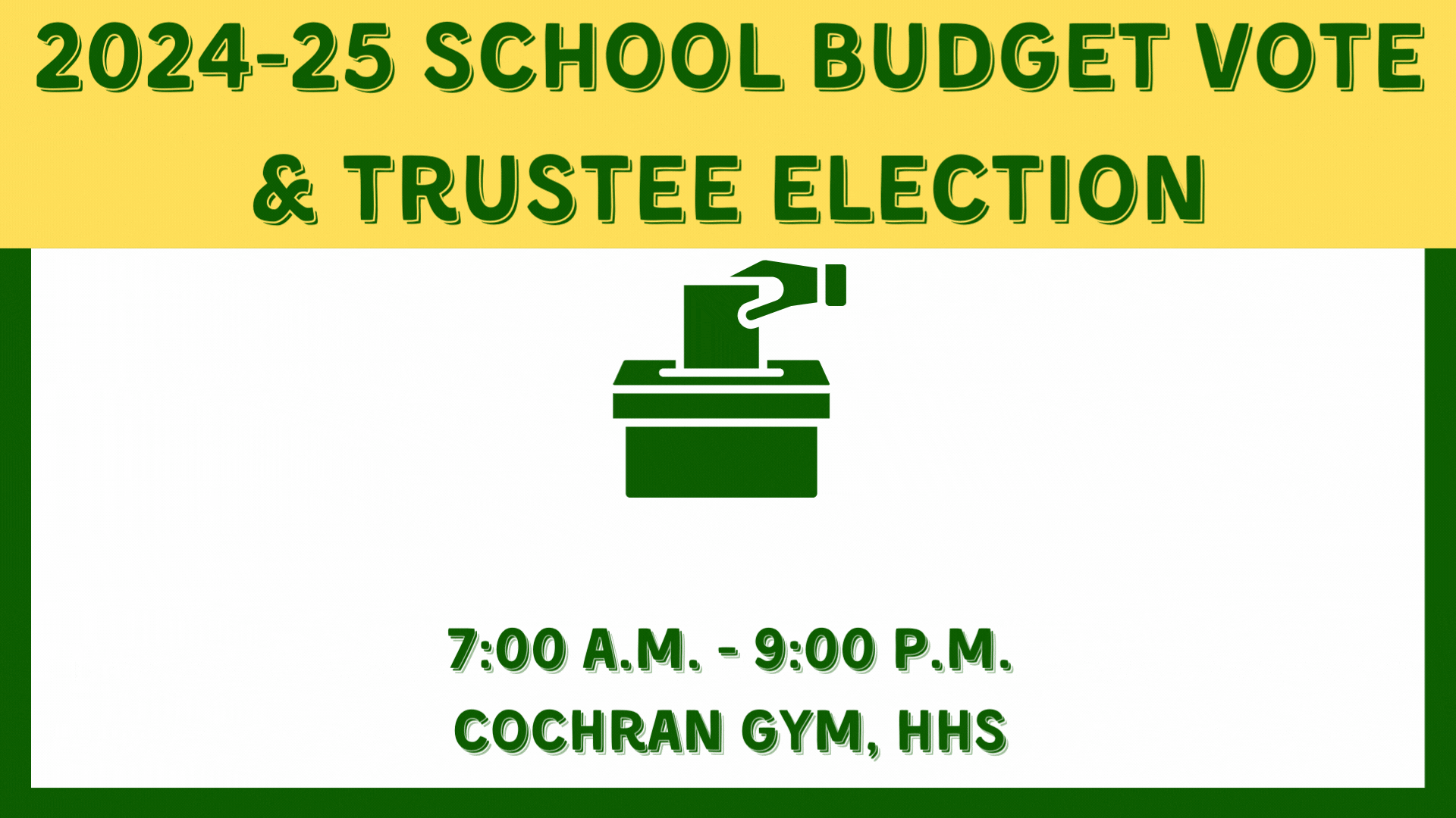 Wednesday, May 15, 2024: Voter Registration 4:00 p.m. - 8:00 p.m. in the High School Lobby