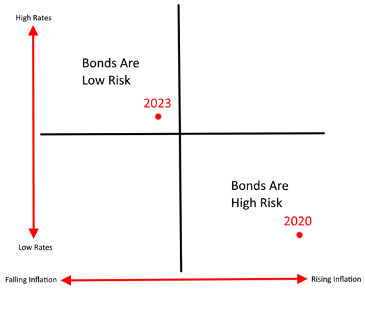 One way to think about this is that zero credit risk instruments like T-Notes become riskier when rates are low (and inflation risk rises) and less risky when rates are high (and inflation risk falls, which is where we seem to be headed now). So, the potential risk adjusted return dynamics are very different in a world where rates are high and unlikely to keep rising.