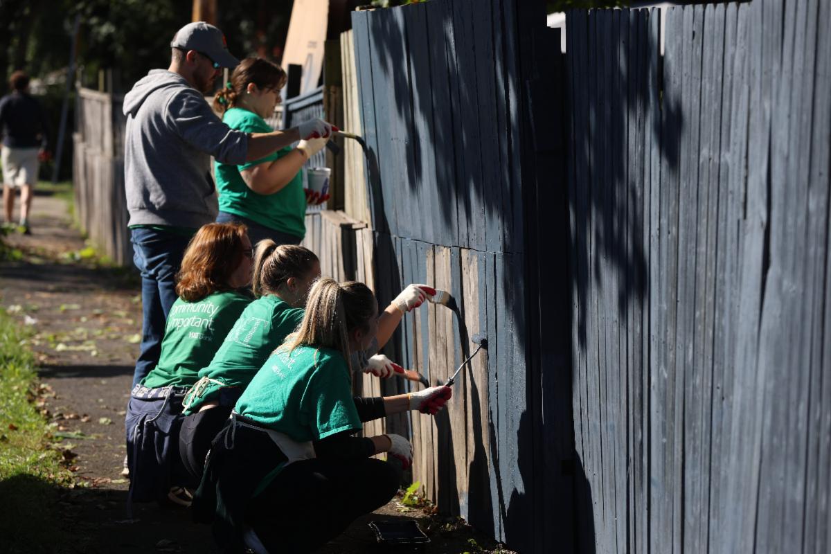 Some of the M&T Bank Volunteer Crew carefully paint a fence with their giant brushes and rollers | |