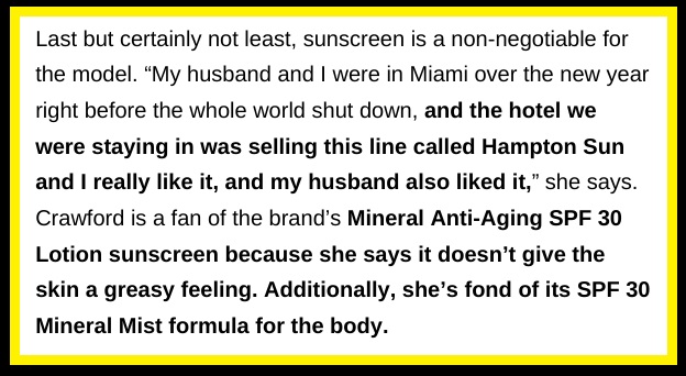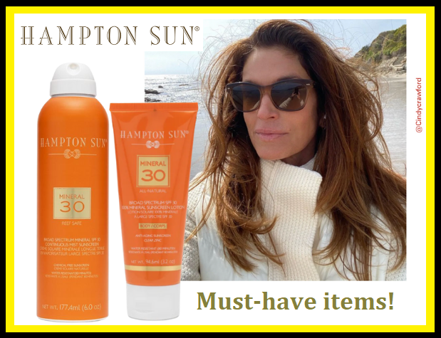 See Cindy Crawford's Must-Have Items! The Hampton Sun SPF 30 Spray Mist and SPF 30 Lotion in a TUBE. Good enough for Cindy, good enough for you! | |