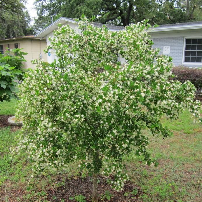 If planted in full sun, the plants grow densely and form a great hedge, but it tolerates light shade. Soils can be coastal sand or average inland soil. Once established it will be very drought tolerant. Expect this shrub to grow 10-12 feet tall in Tallahassee.