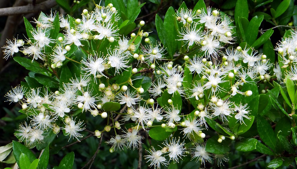 If you live near the Gulf coast, or even if you do not, the native shrub Simpson’s Stopper is a unique addition for your yard. As the botanical name suggests, the blossoms produce a strong fragrance. The evergreen leaves contrast beautifully with fresh, incoming leaves which can range in color from bright green to deep red. When crushed, the leaves give off a spicy-citrusy scent like nutmeg. The dainty yet showy white flowers attract bees and butterflies in the spring, while its large orange to red berries ripen in late summer for a bird buffet.