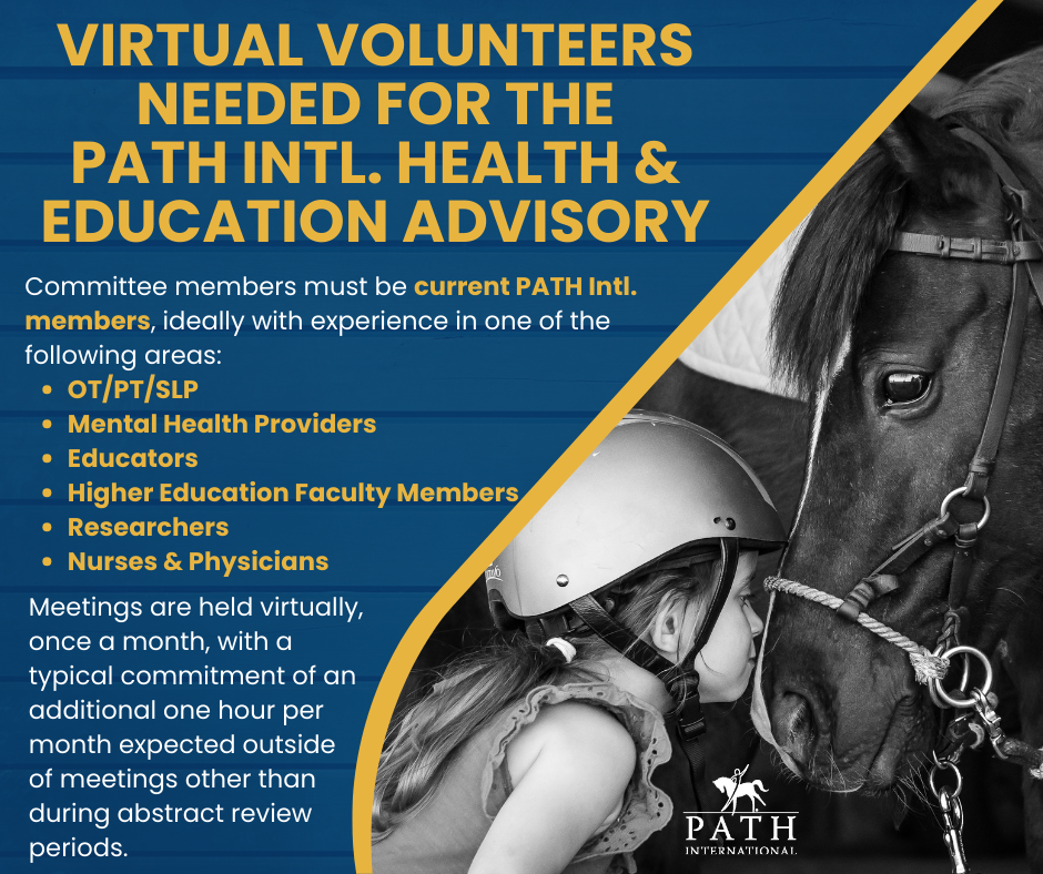 The advisory guides PATH Intl. staff on relevant internal education, new and upcoming research and review of third-party education partner content. Members also help with the review of region and international conference abstracts, consult on health and safety questions brought to PATH Intl. that relate to EAS topics, as well as provide relevant feedback on certain sections of the PATH Intl. Standards for Certification and Accreditation as requested. To apply please fill out the 2024 PATH Intl. Volunteer Application found here. Select the Health and Education Advisory from the committee options. | |