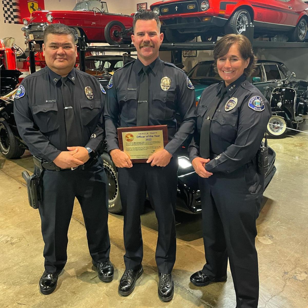 Congratulations to Officer Chris Greeley, who received the Vehicle Theft Officer of the Year Award for recovering the most stolen vehicles in Costa Mesa last year.