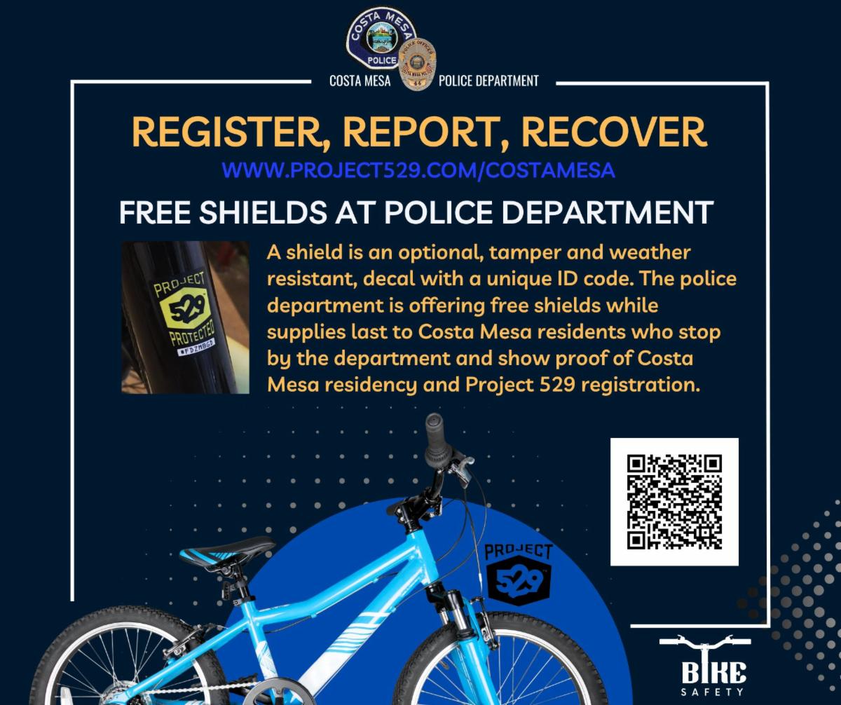 The Department is offering free shield decals for easier identification of your bike. Just register your bike and come on down to the PD at 99 Fair Drive with proof of Costa Mesa residency.