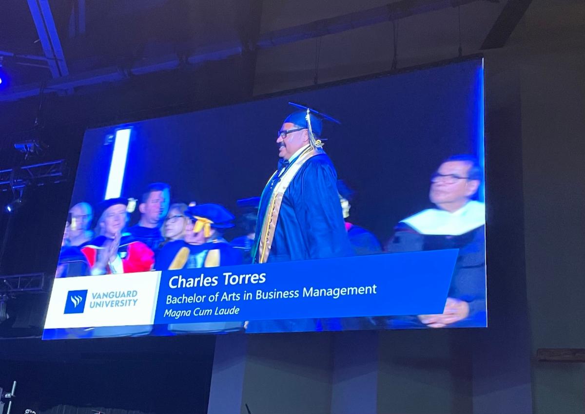 Costa Mesa Fire & Rescue (CMFR) Fire Captain Chuck Torres graduated Magna Cum Laude from Vanguard University and, notably, was selected as the class keynote speaker for Vanguard’s Professional Studies.