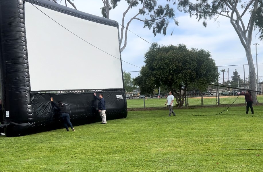 Recreation Coordinator Enyelber Franco taught staff how to set up and tear down the 24 foot by 13 foot, 300 pound outdoor projector screen and AV equipment.