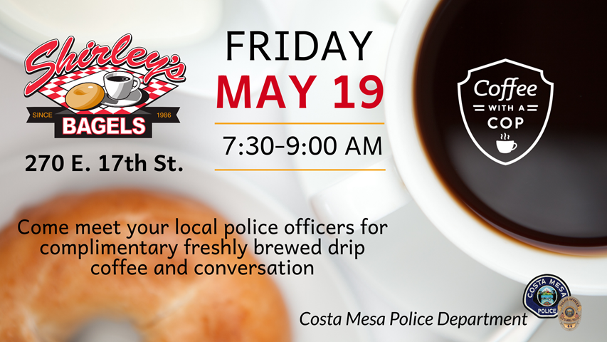 Join the CMPD for Coffee with a Cop on Friday, May 19 from 7:30 a.m. – 9:00 a.m. at Shirley’s Bagels located at 270 E 17th St. Suite 1 in Costa Mesa.
