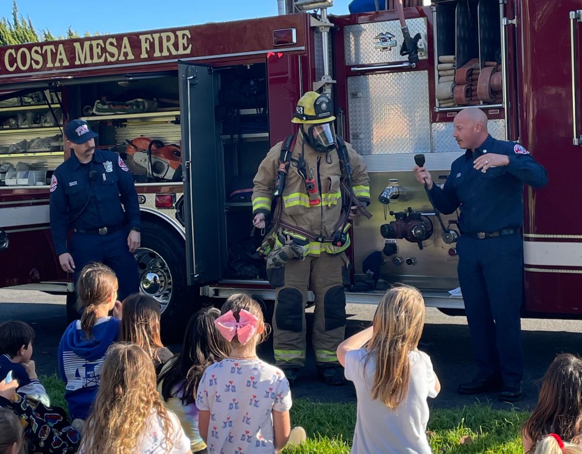 The crew consisted of Fire Captain Travis Johnson, Engineer Anthony Mancillas, Firefighter Paramedic Kevin Humphreys, and Firefighter Paramedic Mitch Diamond. Captain Johnson led the presentation and gave a brief overview of general fire safety practices for families.