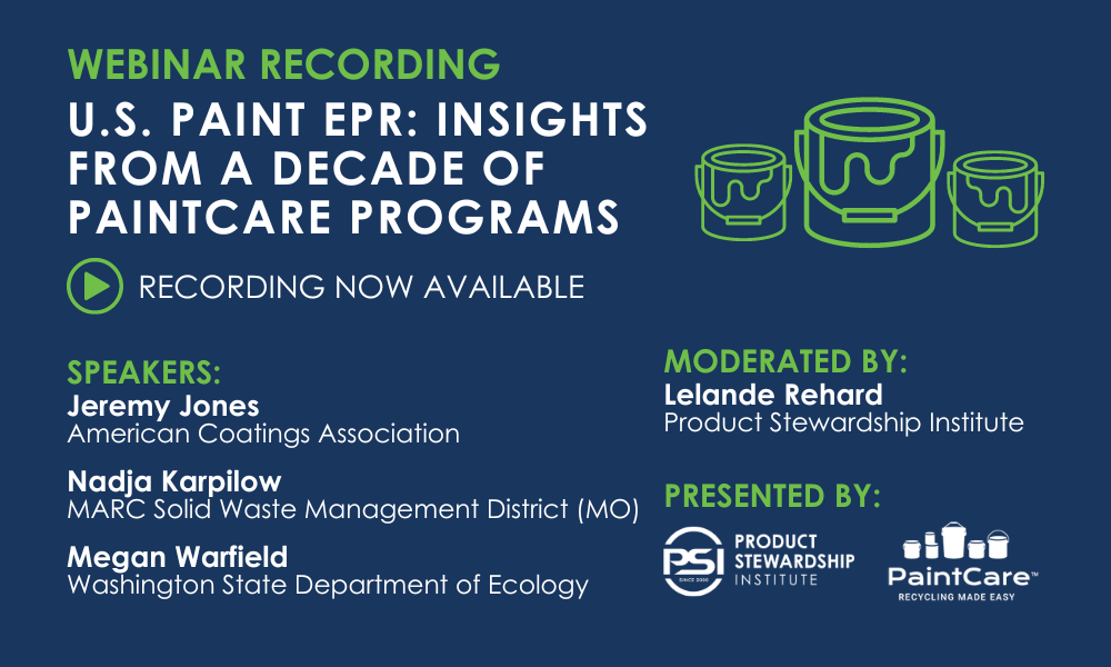 By January 2026, PaintCare, the highly successful paint stewardship program, will serve 31% of the U.S. population across 12 states and the District of Columbia. Last month, PSI and PaintCare co-hosted “U.S. Paint EPR: Insights from a Decade of PaintCare Programs,” a webinar that explored the many successes of the program – including the creation of 2,400 collection sites, 70 million gallons collected a 74% rate of combined recycling and reuse, and municipal savings of more than $395 million. Moderated by PSI’s Lelande Rehard, speakers included Jeremy Jones from PaintCare, Megan Warfield of Washington Ecology, and Nadja Karpilow from the Mid-America Region Commission Solid Waste Management District in Missouri. The webinar covered lessons learned and recommendations for passing legislation and implementing the program, the continued expansion of the PaintCare into aerosol coatings, and the emerging landscape of packaging and HHW EPR laws as they relate to the PaintCare program. | |