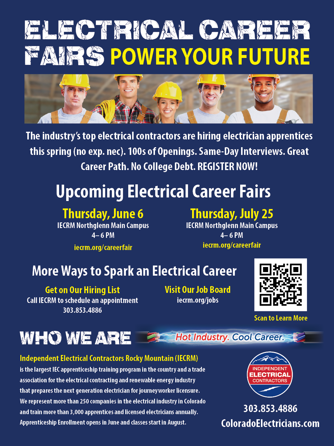 IN-PERSON CAREER FAIR to be held at the main IECRM campus in Northglenn on Thursday, June 6, from 3:00 PM - 6:00 PM. Contractors should arrive no later than 2:00 PM to have adequate time to set up their booth/display. The first hour (3:00 PM to 4:00 PM) will be reserved for AMPLIFY Pre-Apprenticeship graduates, and then the doors will open to the public.