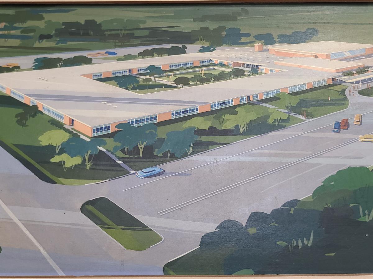 In June 1959, voters of the Libertyville/Fremont High School District approved a $2.8 million bond referendum for the construction of a new, 183,000 square foot High School in Mundelein. Later that year, Architects Berger-Kelley-Unteed & Associates of Champaign, IL presented this architectural rendering (shown above) of the proposed facility with capacity for 1,500 students, 30 classrooms, 9 science rooms, 3 study halls, a library, 826-seat auditorium, 2 gymnasiums, a 400-seat cafeteria, 6 industrial arts shops, 4 language labs, and football stands with seating for 1,200 fans.
