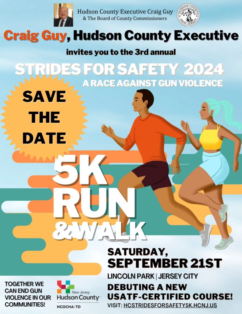 On Saturday, September 21 at 9am, join Hudson County and County Executive Craig Guy for the 3rd annual Strides for Safety 5K in support of gun violence prevention efforts. Click here to sign up (it's not too late!) - and feel free to reach out if you want to coordinate your participation with a larger group.