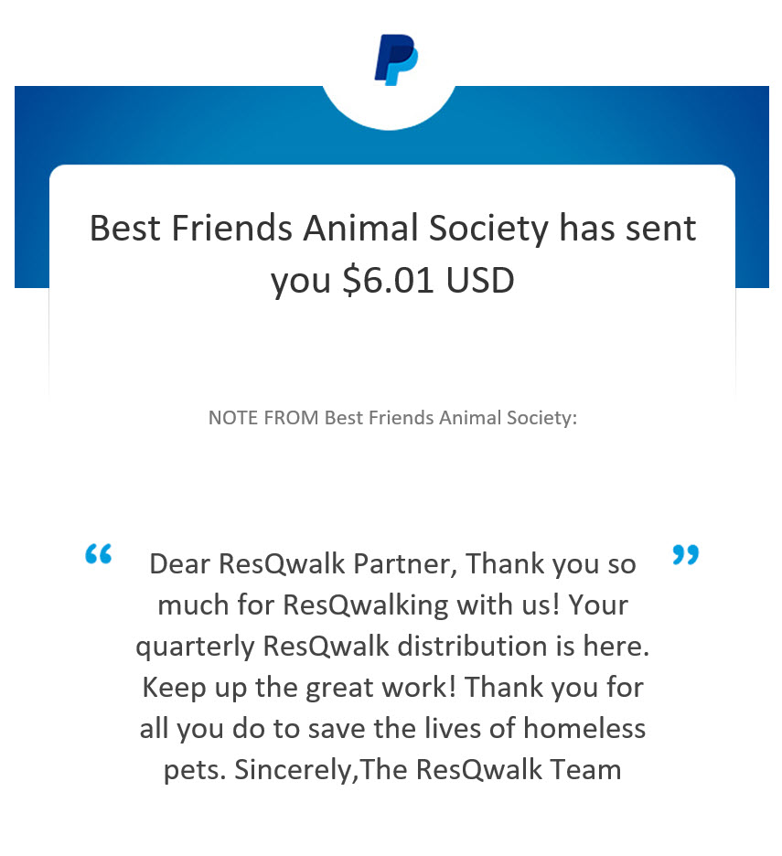 (now owned and maintained by Best Friends) is an app you can install on your Apple or Android smartphone and use to keep track of your walks. Charities registered with ResQWalk compete to see how much of a predetermined pool amount they can win for their charity based on the amount of miles they walk while using the app.
