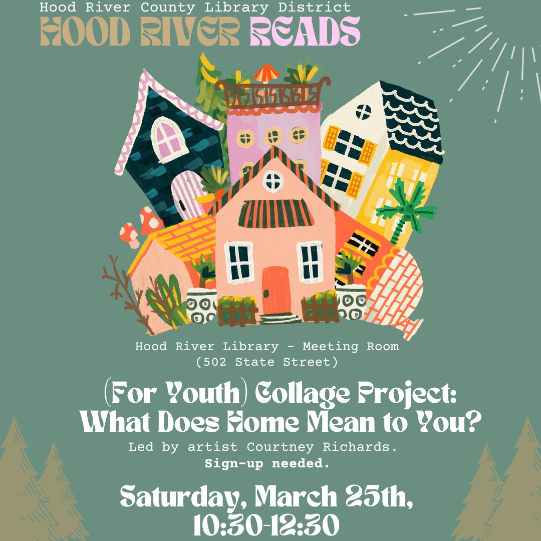 March 25, Saturday 10:30-12:30 - Collage Project: What Does Home Mean to You? (For Youth). Led by Artist Courtney Richards. Sign-up needed starting Sat. March 4. Sign up through the website or by calling the library.