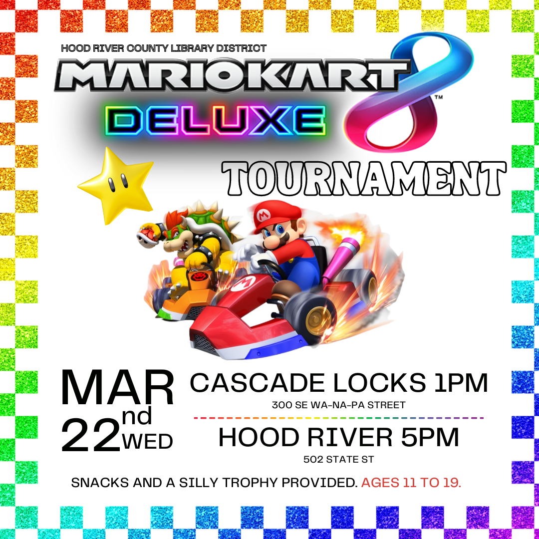 | Go the distance and go for speed (and glory) in Mario Kart! Teens can play to win, play to crash, or eat snacks and cheer each other on. Snacks and a silly trophy provided. Ages 11 to 19. |