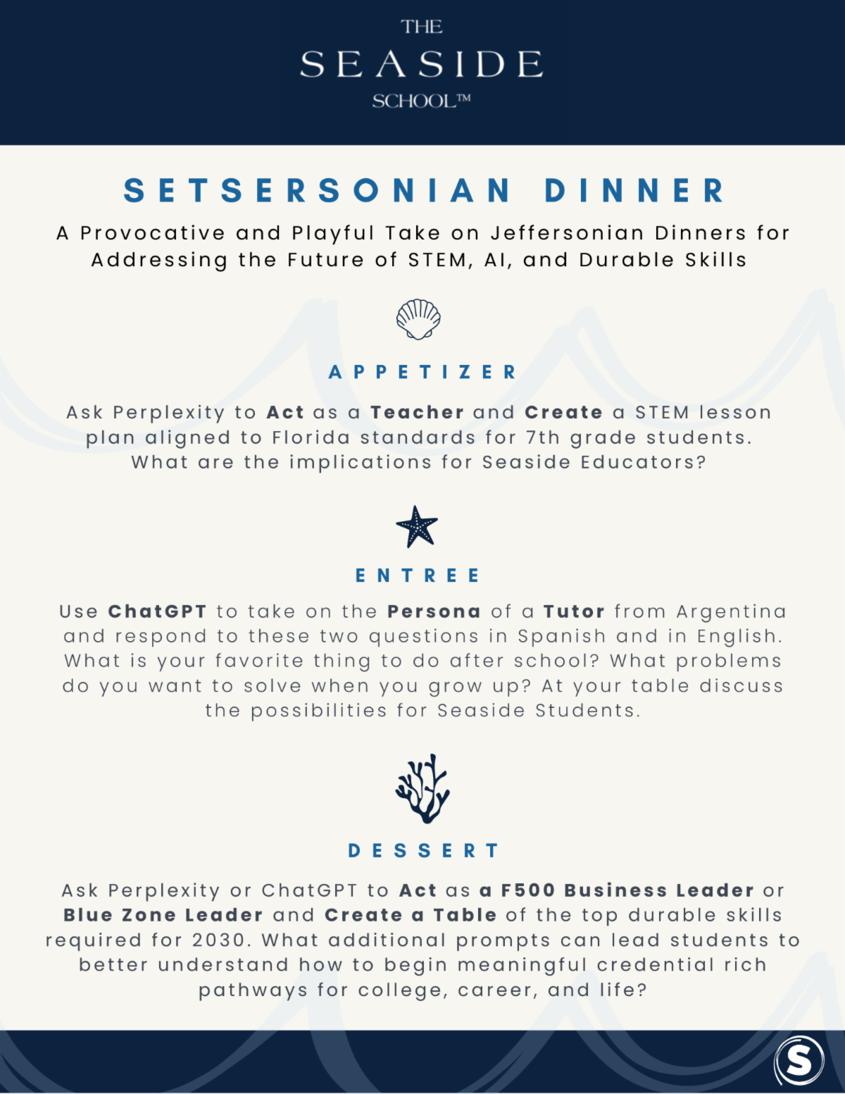 Dr. Miller tasked Setser Group with preparing a Setersonian Dinner for members of his board, his team, and town management. The purpose of the dinner was to demystify AI and also to have a conversation about how we keep humanity at the center of a foray of preparing Seaside students for any future. Our CEO, Bryan Setser, facilitated the dinner and wrapped the evening's conversation around three prompts that allowed the table to both experience AI and one another in the crucial conversations that lay ahead for Seaside.