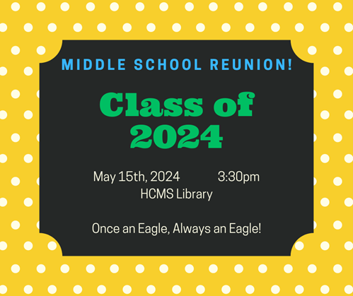 Past Eagles Graduating from High School: You are invited to a middle school reunion on May 15th at 3:30pm in the HCMS Library! Come reconnect with your middle school teachers and other past Eagles!