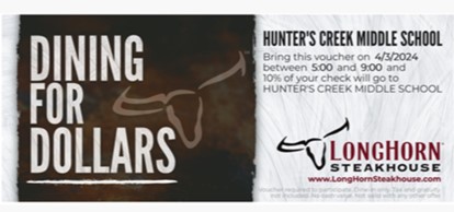 Eagle Parents! We are looking forward to seeing you at the HCMS LongHorn Steakhouse Spirit Night on Wednesday, April 3rd, from 5:00 pm to 9:00pm. Don’t forget to bring with you a copy of the Dinning for Dollars coupon!