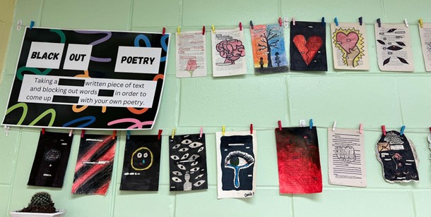 Ms. DeLuca’s reading classes created Black Out Poetry as one of their assessments for their poetry unit; the exemplar poems are displayed in the library.