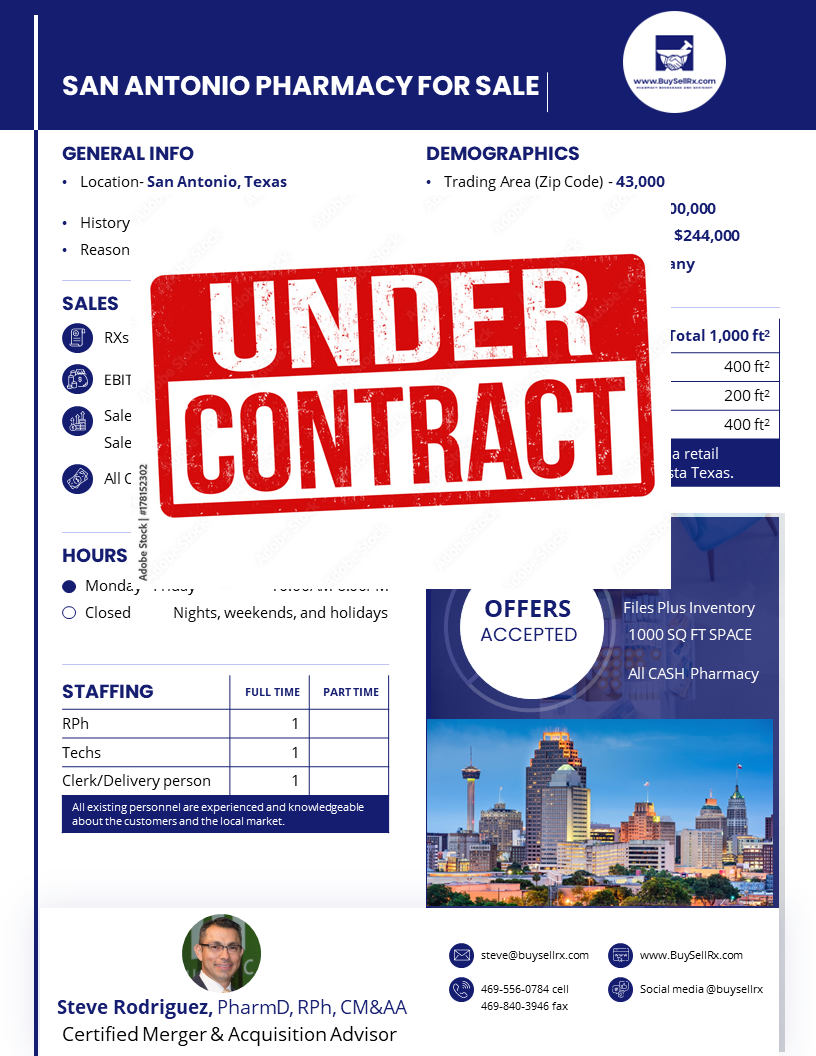 Call/text Steve Rodriguez, PharmD, RPh, CM&AA at 469-556-0784 or email steve@buysellrx.com for more information. For more information, click here.