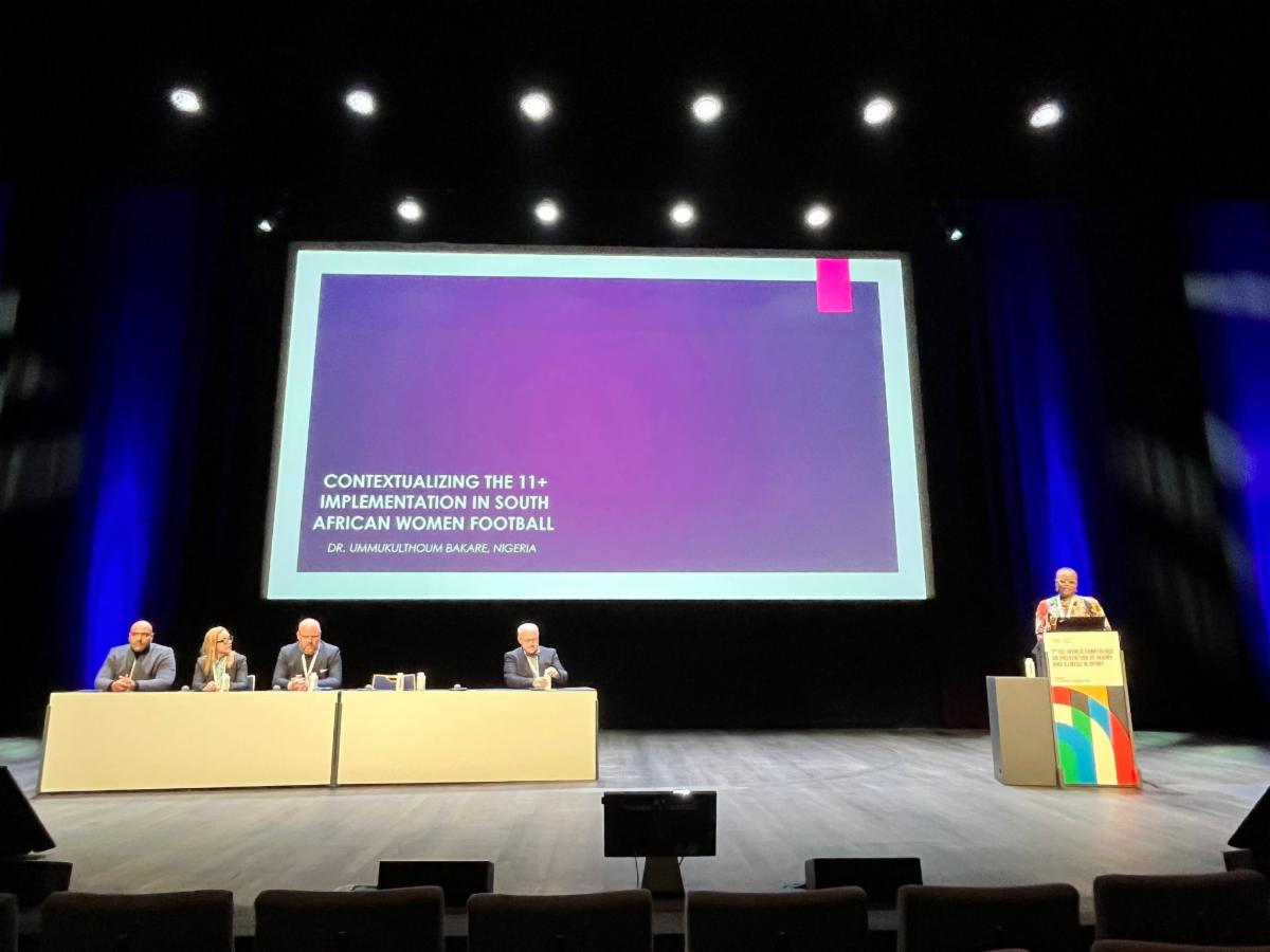 | | Speakers for the FIFA 11+ presentation: Wesam Al Attar, Matt Whalen, Holly Silvers-Granelli, Ummukulthoum Bakare, and Mario Bizzini. Below, Ummukulthoum Bakare presents. | |