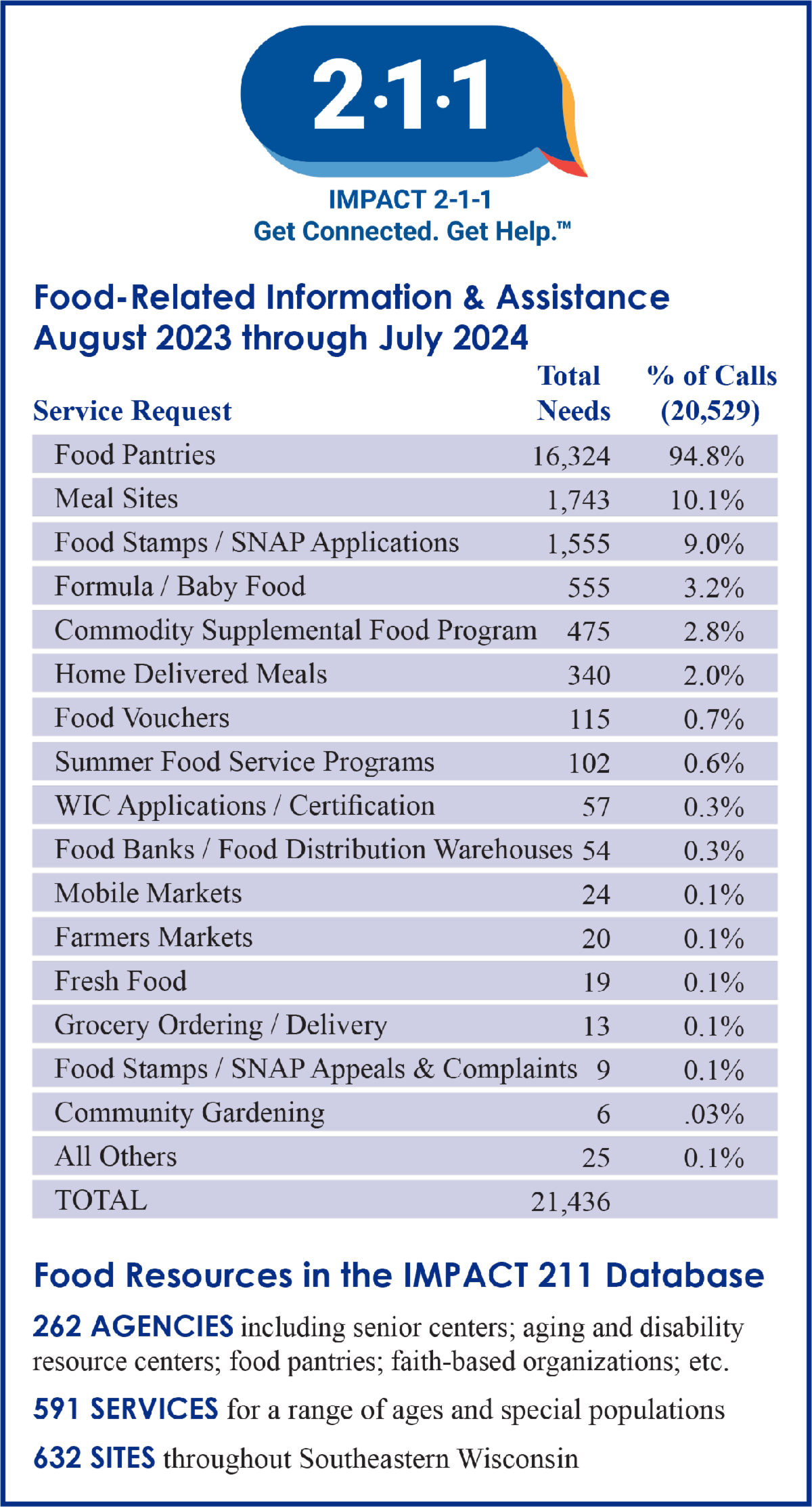 In 2022, IMPACT 211 responded to 12,509 requests for food resources, which accounted for 9.5% of all calls that year. By comparison, IMPACT 211 received 21,436 food requests over the past twelve months representing 16% of total calls. Of those who called for food assistance, 95% received a food pantry referral.