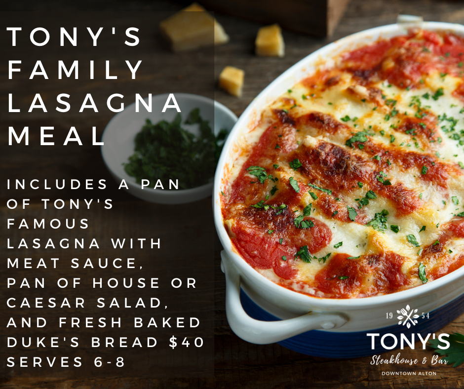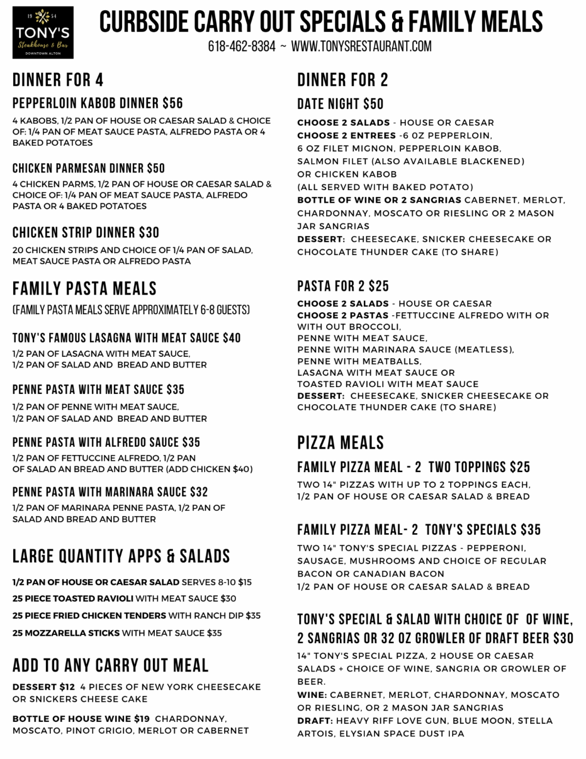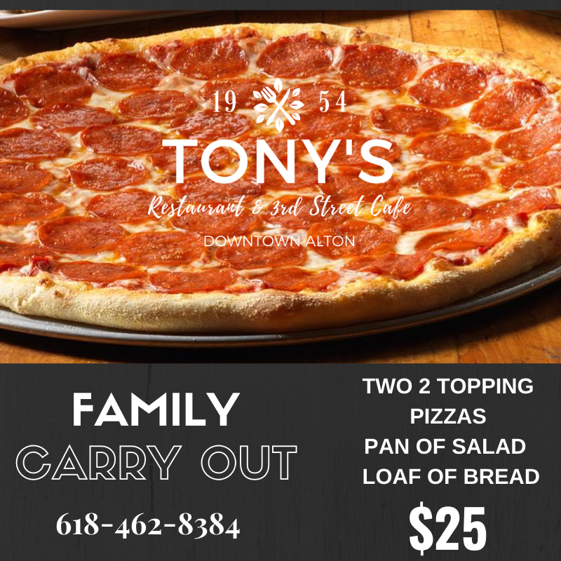 Curbside orders taken after 3:30 pm by phone or anytime of day online for scheduled pick ups after 4 pm. 618-462-8384 or tonysrestaurant.com
