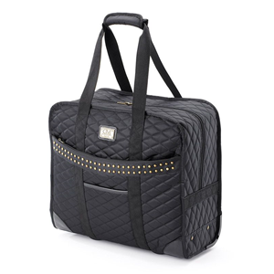 Easy Glide WheelsThe GMinc Tote On Wheels is made of lightweight durable quilted nylon with rivet detail design. A must have for travel trade shows office or just shopping around town. Shoulder straps with handle grip locking push button telescopic handle with quiet smooth easy glide wheels.