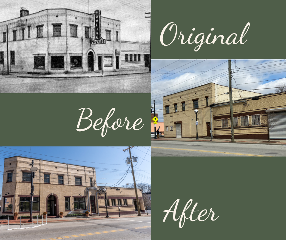 Mergard Lanes was built as a community bowling alley in 1930 in the Art Deco Style. Glass block and curved features contribute to its Art Deco appeal. The first floor was originally a bowling alley and later a series of retail establishments including a shoe warehouse. The partial second floor was maintained as apartments with a dedicated entrance from Hamilton Ave. The building was vacant for many years before the renovation.