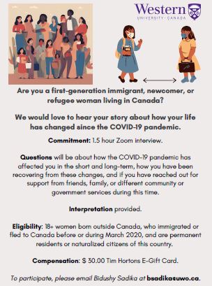 For more information, click here. To participate, please email Bidushy Sadika, PhD Candidate in Migration and Ethnic Relations at Western University, at bsadika@uwo.ca