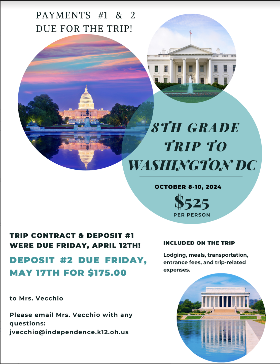 The seventh-grade trip to Michigan is scheduled for Thursday, May 23, 2024. As posted on Progress (homework) and on the digital homework board for the past several weeks, the payment of $143.00 is due by Friday, May 3, 2024. Checks should be made payable to: Independence Middle School. Cash is also acceptable. For those who have already submitted payment, thank you. Should you have any questions, feel free to contact me via phone (216-642-5865, ext. 1334) or email.