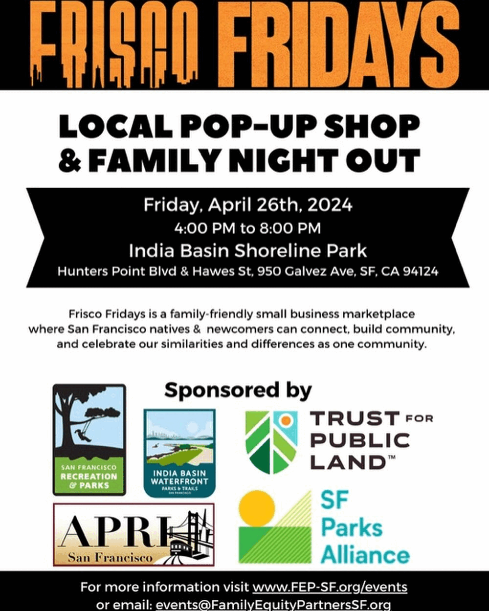 Family Equity Partners and the India Basin Waterfront Park project partners are proud to bring Frisco Fridays to India Basin Shoreline Park (Hunters Point Boulevard and Hawes Street) to continue this event series in 2024. Join us for the next one on Friday, April 26 from 4 to 8 p.m. at the park, which will feature a fashion show by the event vendors. Come out for a fun-filled evening of music, food, games, children activities, community vibes and plenty of green space to enjoy.