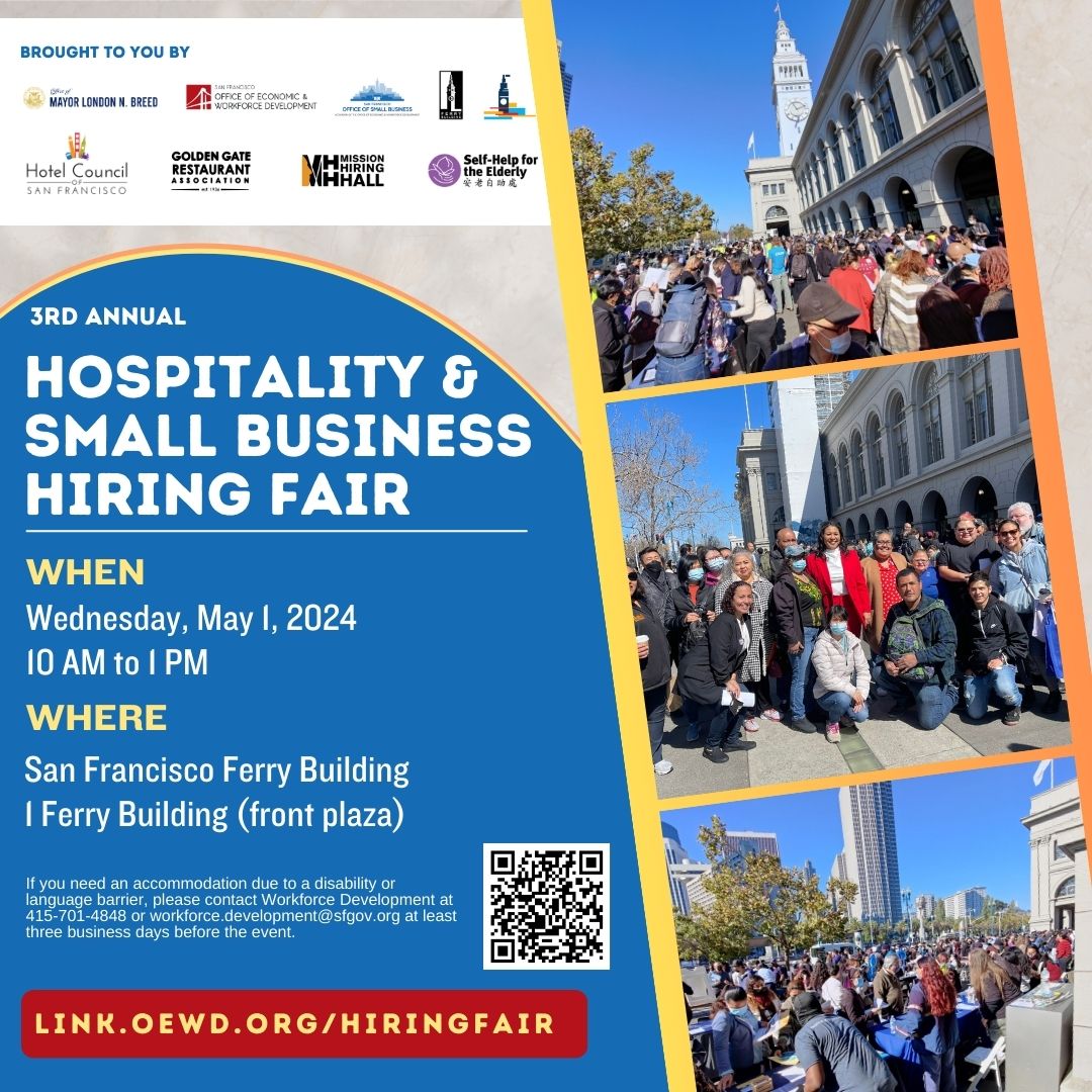 Looking for a job in hospitality? The San Francisco Office of Economic and Workforce Development is hosting its 3rd annual hospitality and small business hiring fair at the San Francisco Ferry Building's (1 Ferry Building) front plaza on Wednesday, May 1 from 10 a.m. to 1 p.m. More than 50 employers with hundreds of career opportunities will be on hand to meet with job seekers. Positions include roles with hotels, restaurants, security and retail. For more information and to RSVP, click the link below.