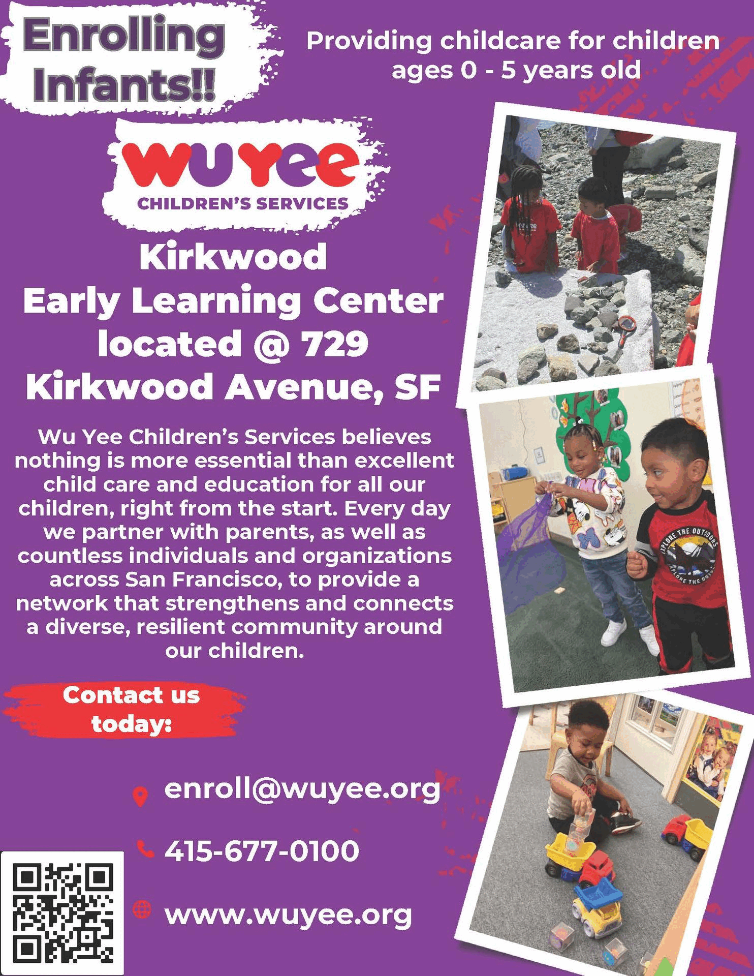 Wu Yee Children’s Services is enrolling youth ages 0-5 for its early childcare services at the Kirkwood Early Learning Center (729 Kirkwood Avenue). Wu Yee believes nothing is more essential than excellent child care and education for all children, right from the start. Every day they partner with parents, as well as countless individuals and organizations across San Francisco, to provide a network that strengthens and connects a diverse, resilient community around our children. If you're interested in enrolling your child, fill out an interest form at the link below.