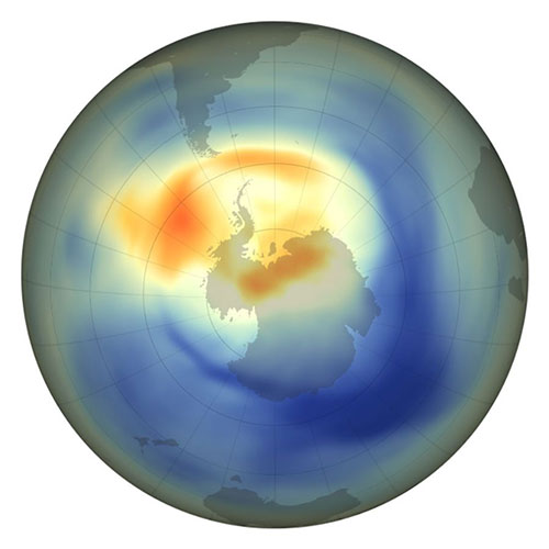 The world has phased out nearly 99 percent of ozone-depleting substances since the signing of the 1987 Montreal Protocol. The graphic shows in red the pockets of low ozone in 2019. While the situation is much improved since the worst levels in the 1990s and 2000s, the United Nations says the ozone hole over Antarctica won’t heal until 2066. Photo by NASA Earth Observatory