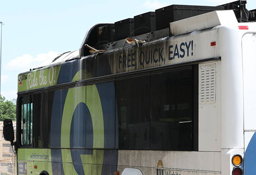 A city electric bus that caught fire sits in the lot of the Wichita transit maintenance building at 777 E. Waterman waiting to be inspected by the manufacturer. (Eduardo Castillo/The Wichita Eagle)